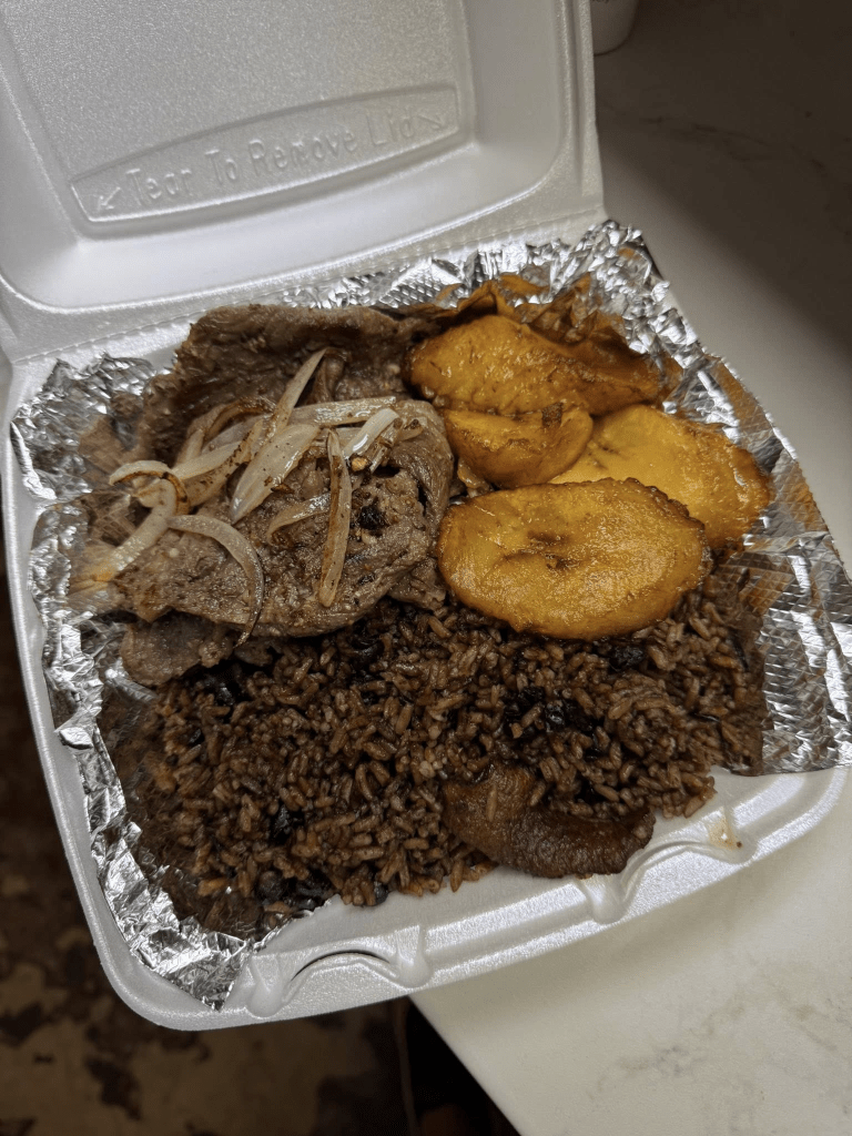 Their menu includes roast pork, Ropa Vieja, Uruguayan steak, onion steak, and picadillo, accompanied by all the traditional rice and side dishes. The space is cozy with a few tables, perfect for enjoying a quick and delicious meal.